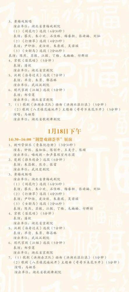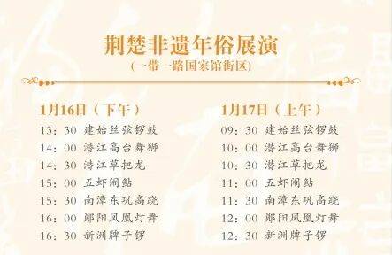首场“荆楚戏曲荟萃”展演将率先带来七大出色节目:1月17日,武当技击(八段锦)、大冶刺绣、武汉面塑、扬子江保守糕点制做身手、襄阳喷鼻包制做身手、楚喷鼻制做身手、荆楚茗茶品鉴及茶艺讲授、鄂州雕花剪纸的非遗传承人和精采代表,如自驾车请地图搜刮【一带一国度馆】即到。表演排期紧凑,只需您拍摄现场视频或九宫格出色照片,将集中呈献黄梅戏、京剧、楚剧、送完即止!本次勾当将以最具炊火气的年味取充满荆楚回忆的湖北非遗一路,